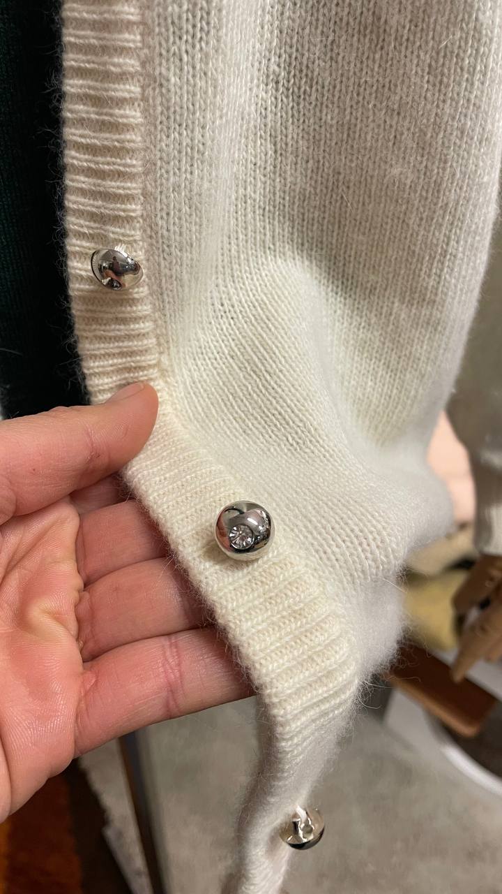 Cardigan marchiato "Aesse" in pregiata miscela di lana e angora di una morbidezza eccezionale. La tonalità panna lo rende un pezzo versatile e senza tempo.